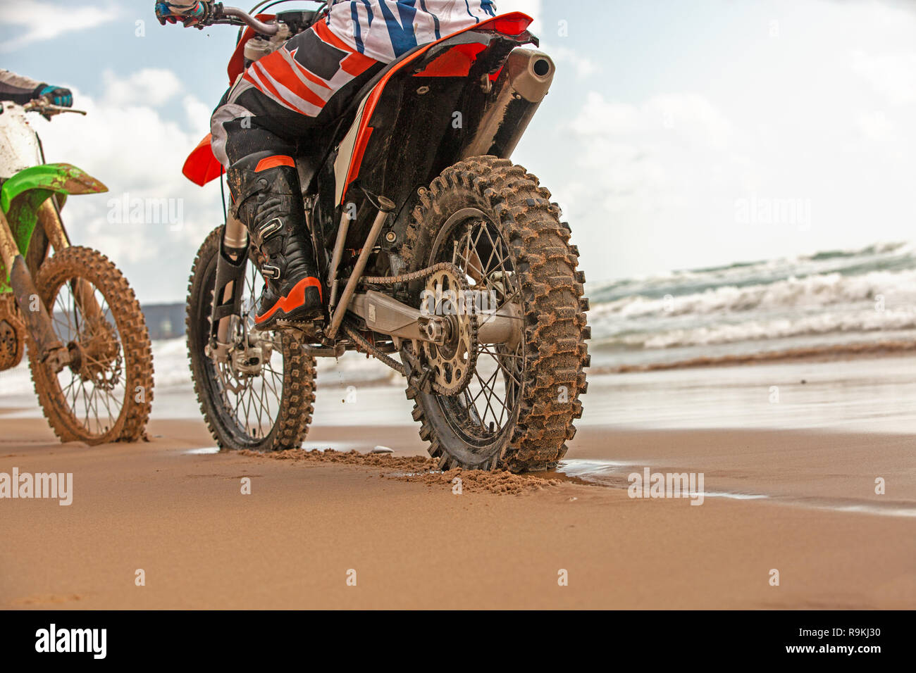 Motociclista En Un Traje De Proteccion Monta Una Moto En El Mar