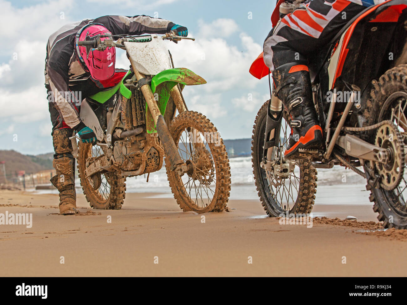 Dos Motociclistas En Un Traje Protector Sentados En Motos Uno